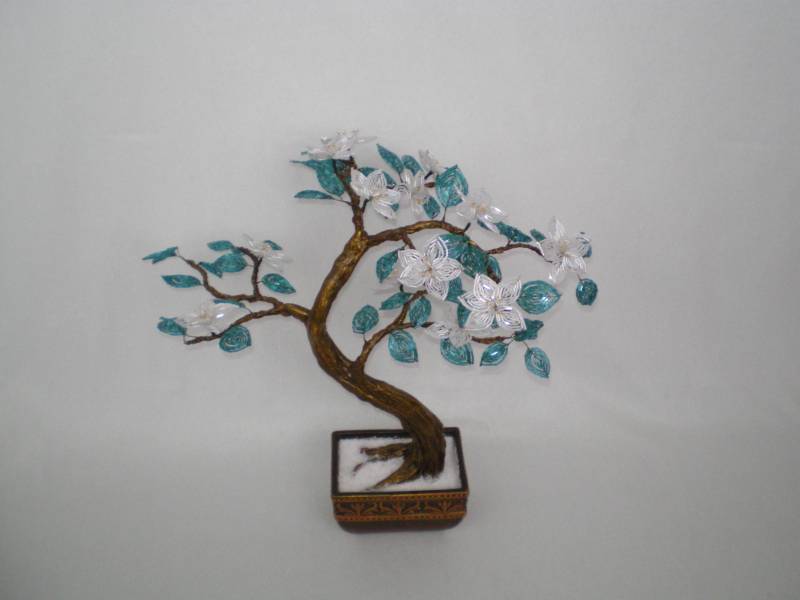 Крона дерева выполнена из стекляруса, ствол - из гипса, "посажено" в керамический горшок. Высота примерно 50см.